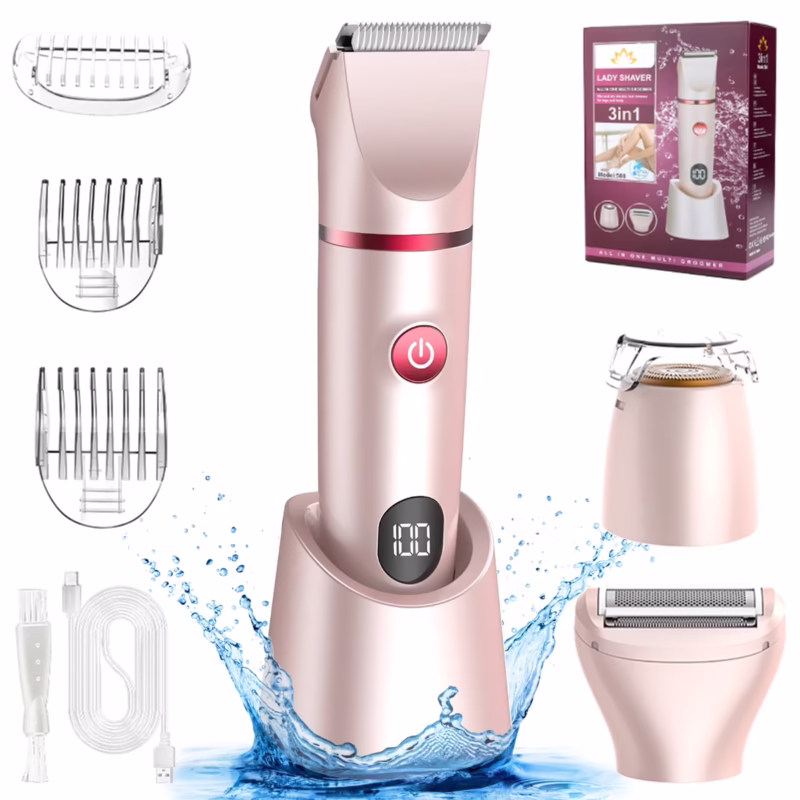 The Rirool 3-in-1 Bikini Trimmer for Women is a versatile, waterproof electric razor kit designed for full-body grooming. Featuring three interchangeable heads for precise bikini trimming, facial hair removal, and smooth shaving of arms, legs, and underarms, it delivers gentle, painless results with hypoallergenic ceramic blades. The cordless, USB-rechargeable design with LED display provides up to 60 minutes of runtime, making it perfect for travel or home use. Compact, lightweight, and easy to clean, this multifunctional trimmer is ideal for daily grooming and makes a thoughtful gift for birthdays, holidays, or any occasion.