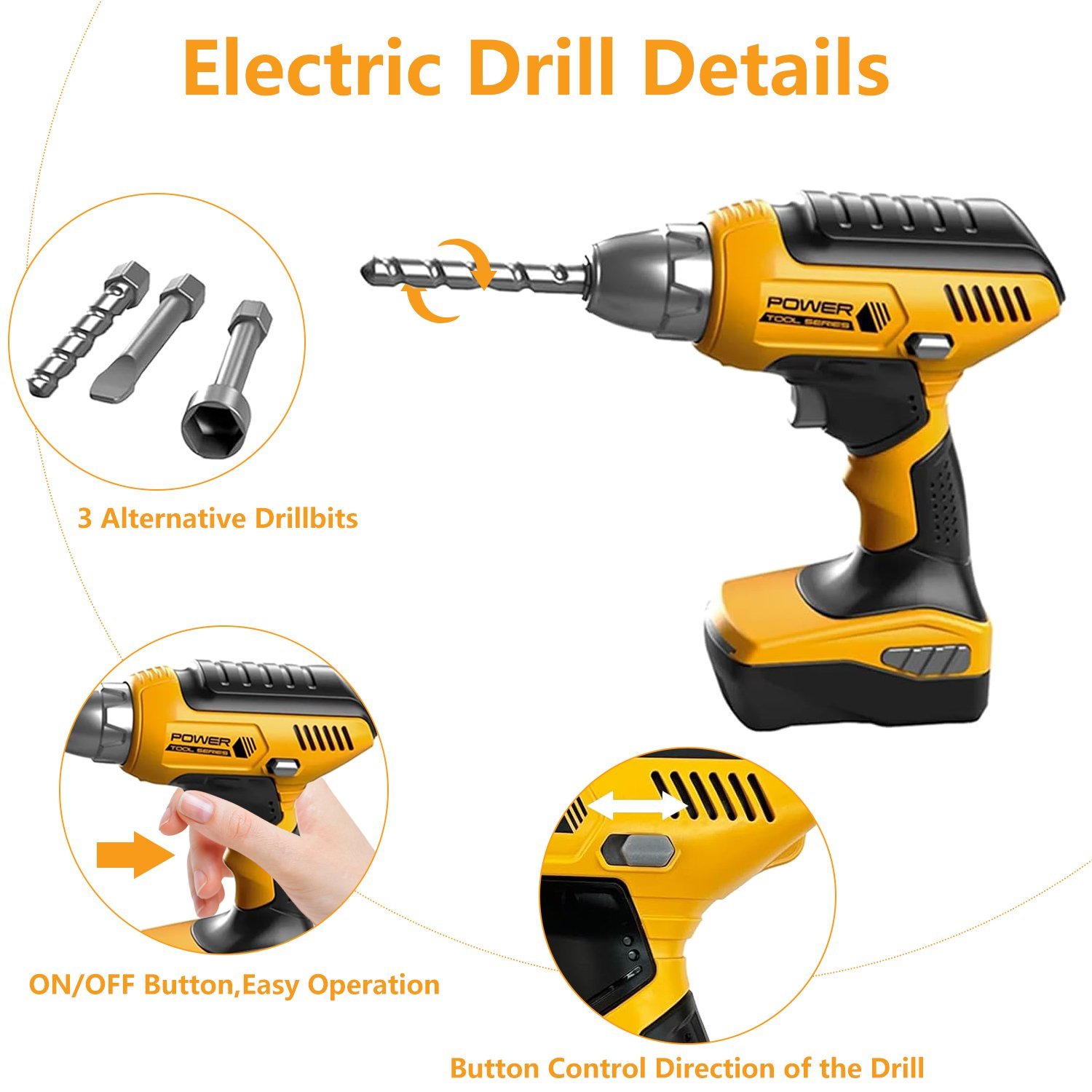???? Interactive Electric Drill – Realistic sounds and motions with 3 interchangeable bits (requires 2×AA batteries, not included).